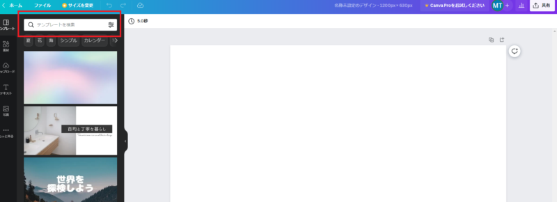 テンプレートの下に素材、アップロード、テキスト、写真がありますのでそちらから選びます。