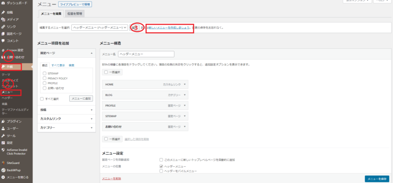 「新しメニューを作成しましょう」をクリックして選択してください。