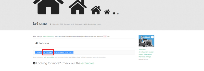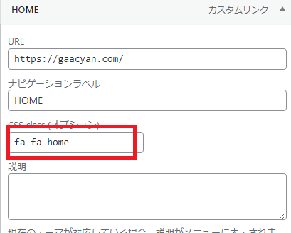 homeマークでしたら赤のカッコ内の「fa fa-home」をコピーしてはりつけます。