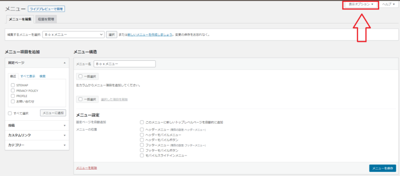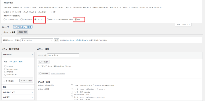 ボックスメニューの項目は、少し下にある「メニュー項目を追加」から、「固定ページ」「投稿」「カスタム」に登録してある、お好きな項目を選んでボックスメニューに表示することが出来ます。