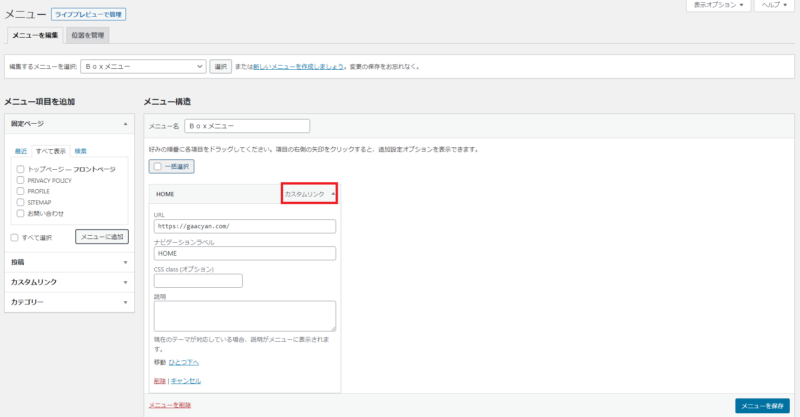 今回は、カスタムリンクの「HOME」「カテゴリー」固定ページの「問い合わせ」の項目からボックスメニューに表示したい項目を選んで進めます。