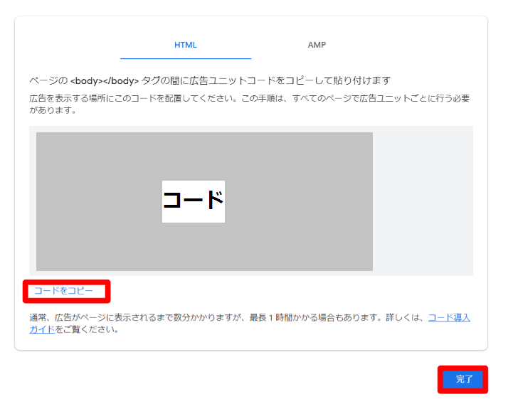 広告コードが表示されますのでこちらの[コードをコピー]をクリックして完了をおします。