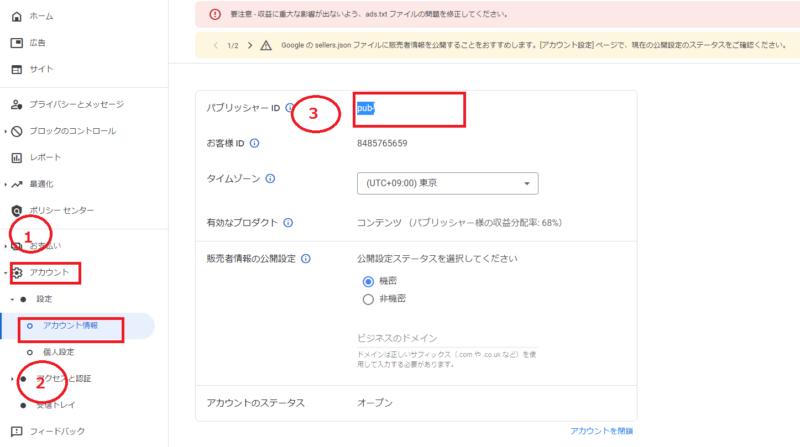 ①アドセンスページのアカウント → ②アカウント情報 → ③パブリシャーID に記入されているのでコピーして先ほどの赤いカッコ内に入力してください。